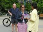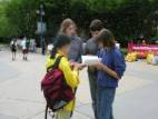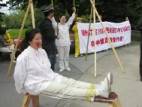 Après que la parade fut finie, les pratiquants sont allés au Prince’s Island Park et ont tenu un rassemblement à l’entrée de la ville. Le thème du rassemblement était : « Arrêter la persécution et traduisez devant la justice les propagandistes de haine. » Les pratiquants ont aussi montré les exercices du Falun Gong et représenté certaines méthodes de torture exécutées contre les compagnons de pratique en Chine. Les touristes ont eu la chance d’en savoir davantage sur le Falun Gong et la persécution qui se passe en Chine. Les uns après les autres, les passants ont exprimé leur soutien et ont signé la pétition contre les fonctionnaires chinois diffusant de la propagande haineuse contre le Falun Gong au Canada.