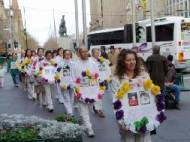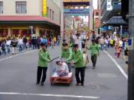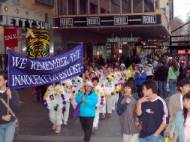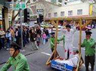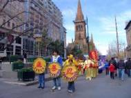 À midi, la marche des pratiquants a commencé. Ils ont défilé dans le centre-ville, y compris le Chinatown. Trois enfants qui ont respectivement tenu les 3 mots : Vérité, Compassion et Tolérance, étaient en tête du cortège. La Troupe de tambours à la ceinture et une équipe de drapeaux de différentes couleurs, rouge, orange, jaune, vert, turquoise, bleu et pourpre, suivaient les enfants. Derrière eux se trouvait un groupe de pratiquants avec des photos des pratiquants qui sont morts de la persécution. Après, ils y avaient une exposition des méthodes de torture employées dans la persécution et d'une équipe demandant d’amener Jiang à la justice.