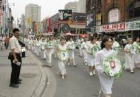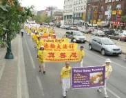 Le défilé après le rassemblement incluait plusieurs cortèges sous différents thèmes: Falun Dafa est grandiose et Falun Dafa au Canada, une démonstration d'exercice de Falun Gong, une troupe des pratiquantes habillées en blanc, tenaient les photos de pratiquantes mortes suite à la persécution, une troupe pour le secours des orphelins de Falun Gong composé d'étudiants de l'école Minghui, et des expositions anti-torture. En plus des défilés précédents, il y avait les amis et défenseurs de Falun Gong, ce qui a créé un ensemble mémorable et extrêmement attrayant.