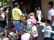 De jeunes enfants reçoivent des ballons colorés et des signets avec joie