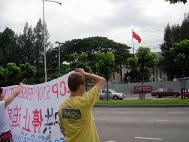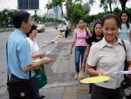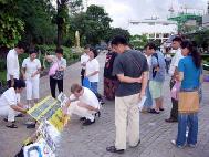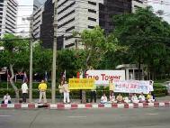 Le 20 juillet 1999, le groupe de Jiang a lancé une persécution brutale contre le Falun Gong. La répression continue depuis six ans. Le 23 juillet, afin de commémorer la mort de plus de 2.000 pratiquants tués sous la persécution et pour exprimer leur appui, les pratiquants de Falun Gong en Thaïlande se sont rassemblés devant l'ambassade chinoise à Bangkok vers 17 h00. Ils ont apporté des bannières, des affiches de clarification de la vérité, des guirlandes et des bougies pour montrer les faits de la persécution en Chine et pour inviter les gens à s’unir pour arrêter la persécution.