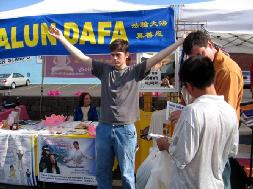 Deux vieilles dames nous ont posées des questions au sujet des exercices. Un pratiquant leur a offert de faire la démonstration du 4e exercice « Le Grand Circuit Céleste ». Lors de la démonstration, l’une des dames s’est écriée : « Je me sens comme dans une piscine! Juste en me tenant ici, je sens les effets. » Les deux dames étaient très enthousiastes et ont pris plusieurs copies de nos dépliants.