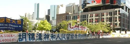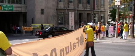 Hu Jintao est arrivé à Toronto à 10 h 30 le 10 septembre 2005 pour continuer sa visite au Canada. Plus de 500 pratiquants de partout au Canada et de quelques endroits aux États-Unis continuent leur appel paisible pour la fin de la persécution devant l’Hôtel Intercontinentale à Toronto où il demeure.