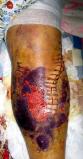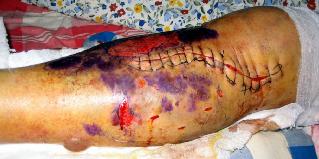 Comme il n’a pas été soigné rapidement, sa jambe fracturée et son pied ont sérieusement enflé, et ont presque doublé de volume. A ce jour, sa jambe n’est toujours pas complètement guérie.