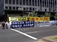 Une grande banderole avec des mots blancs sur fond bleu était composée de 16 panneaux immenses, ayant chacun un seul caractère chinois. Le texte signifiait, "Hu Jintao, le temps que Dieu et le peuple te donnent est limité." Le message était clair et précis et pouvait se voir clairement de l’autre coté de la rue.