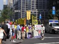 Dans l’après-midi du 13 septembre 2005, lors de l’arrivée de Hu Jintao à New York, les pratiquants de Falun Gong ont tenu un rassemblement paisible à grande échelle devant les Nations Unies et l’hôtel Waldorf-Astoria où séjourne Hu.