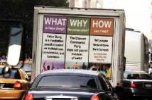 Pour permettre aux gens prédestinés d’obtenir une meilleure compréhension de la vérité, les pratiquants de Falun Dafa ont loué 35 camions, chacun portant des affiches de clarification de la vérité du Falun Gong en chinois et en anglais sur les côtés droit et gauche et à l’arrière. Sur les affiches on pouvait lire, "Falun Dafa est grand," l'"Authenticité, la Bienveillance et la Patience sont grandioses," "Cessez la persécution du Falun Gong," "Hu Jintao, le temps que Dieu et le peuple te donnent est limité," "Traduisez en justice Jiang Zemin, Luo Gan, Liu Jing et Zhou Yongkang," et "Traduisez en justice la police perverse et les autres qui persécutent le Falun Gong." Des remorques de type « U-hall » ont sillonné dans les rues, ce qui a créé une scène impressionnante et émouvante.