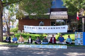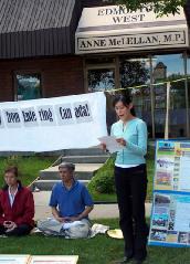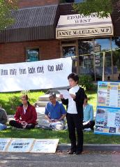 Avant la visite au Canada, de Hu Jintao, chef d'état à la tête du parti communiste chinois (CCP), les pratiquants canadiens de Falun Gong ont tenu une conférence de presse le 31 août devant le bureau d'Anne McLellan, députée siégeant avec le Premier Ministre du Canada et Ministre du Département de la Sécurité Publique et de la Protection civile. Les pratiquants ont fait pression auprès du gouvernement canadien pour qu’il interdise aux criminels qui violent les droits de l'homme des pratiquants de Falun gong, l'entrée au Canada.