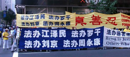 Sur les banderoles des pratiquants de Falun Gong, on pouvait lire : « Traduisez en justice Jiang Zemin, Luo Gan, Liu Jing et Zhou Yongkang. » « Traduisez en justice la police perverse et les autres qui persécutent le Falun Gong » «Hu Jintao, le temps que Dieu et le peuple te donnent est limité.»