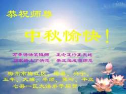 Les pratiquants de Falun Dafa du district de Meizhou de la ville de Meizhou et sept (7) comtés respectueusement souhaitent à Maître un Joyeux Festival de la mi-automne! Les sept (7) comtés comprennent : Mei, Xingning,Wuhua, Dapu, Fengshun, Jiaoling, Pingyuan.