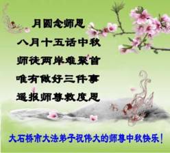 Maître ! Chaque fois lorsque le festival approche, nous vous envoyons nos souhaits les plus secrets; vous manquez aux disciples de Dafa de la Chine continentale, nous anticipons votre visite bientôt Maître afin de pouvoir passer quelques moments ensemble au Festival de la mi-automne!
