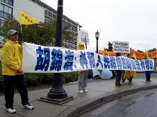 Dans l'après-midi du 16 septembre 2005, Hu Jintao, le chef du parti communiste chinois (PCC), est arrivé à Vancouver au Canada, le dernier arrêt de son voyage en Amérique du Nord. Les pratiquants de Falun Gong ont fait appel autour de l'hôtel Westin Bayshore où Hu demeurait, pour l'inviter à arrêter la persécution du Falun Gong. Les pratiquants tenaient des banderoles disant : « Traduisez en justice Jiang Zemin, Luo Gan, Liu Jing, et Zhou Yingkang », « Traduisez en justice les policiers impitoyables et les autres qui persécutent le Falun Gong. »
