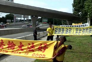 Les pratiquants avaient attendu tout le matin près de l'entrée de l’aéroport sur la route. Ils se tenaient près de la station d’autobus et tenaient des douzaines de grandes banderoles disant : « Falun Dafa est grand », « Arrêtez la persécution du Falun Gong », « Traduisez en justice Jiang Zemin, Luo Gan, Liu Jing, et Zhou Yongkang », « Traduisez en justice la police impitoyable et les autres qui persécutent le Falun Gong » et « Hu Jintao, le temps que le ciel et le peuple te donne est limité ».