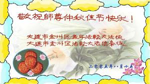 Les pratiquants de Dafa dans le district Jinzhou, ville de Dalian, province de Liaoning, souhaitent respectueusement un joyeux festival de la lune de la Mi-automne au Maître!