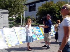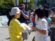 Les pratiquants ont répondu à la question des gens pourquoi le PCC persécute-t-il le Falun Gong et ils leur ont recommandé de lire les Neuf commentaires sur le parti communiste. Les pratiquants ont dit aux gens que le livre raconte l'histoire du PCC et leur apprendra pourquoi la persécution inhumaine a toujours lieu en Chine et pourquoi le PCC est la plus grande menace à la paix dans le monde.
