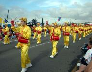 Le long des rues, en partant du port jusqu’au village de «Seaport», environ 100,000 spectateurs regardaient la parade. La parade a été diffusée en direct, sur les postes de la télévision locale et nationale. Le défilé des pratiquants du Falun Gong s’est démarqué des autres équipes de la parade. Leur procession était menée par deux bannières où on pouvait lire ce qui suit : «Falun Dafa est Bon» et, «Vérité Compassion Tolérance». Ensuite, il y avait des joueurs de tambours à la taille, dont les batteurs étaient habillés en habits d’exercices de couleur jaune or avec des bandeaux jaunes, portant leurs tambours rouges lumineux. Derrière l’équipe de joueurs de tambours à la taille, se trouvait le groupe de danse des Fées célestes. Les jeunes femmes pratiquantes du Falun Dafa étaient habillées avec des costumes colorés, comme ceux dans les Murales de Dunhuang et elles ont dansé d'une manière élégante sur la musique. Les spectateurs ont sorti leurs appareils photos et leurs caméras pour pouvoir se remémorer cette scène magnifique.