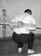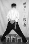 13. Se tenir debout au-dessus de bancs : on oblige les pratiquants à se tenir debout avec deux ou trois petits bancs entre leurs pieds pendant une longue durée, ce qui leur cause une douleur extrême dans les jambes.