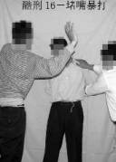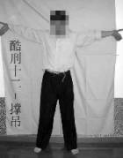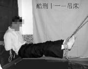 12. Suspendre: Les bras des pratiquants sont tirés et attachés à deux lits. D’habitude, on les attache pendant dix jours, et ils ne sont habituellement détachés que pour un repas par jour et une pause-toilette quotidienne. Les gardes les forcent à garder les yeux ouverts et le corps droit pendant les dix jours. Après être relâchés de cette torture, ils ressentent de graves douleurs sévères dans tout le corps. Leurs yeux sont enflés et leur vue sérieusement endommagée. Parfois ils ont même des hallucinations.