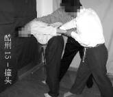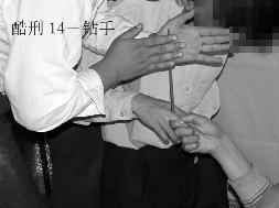 14. Torture avec des baguettes: Les gardes mettent une baguette entre les doigts du pratiquant. Un garde serre les doigts du pratiquant les uns contre les autres et fait pivoter la baguette entre les doigts (note du traducteur : les baguettes en Chine sont angulaires, pas rondes; si on les tourne entre les doigts cela causera douleur et blessures). Les deux doigts se mettent à saigner immédiatement et la chair est sérieusement déchirée. Le garde, après avoir déchiré la chair sur deux des doigts, ne s’arrêtera pas. Ils vont continuer avec deux autres doigts et reprendre la torture. Cette torture endommage gravement les doigts et la victime ne peut rien tenir après. Après que la blessure se soit guérie, les doigts resteront insensibles quelques mois.