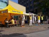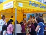Un pratiquant et moi même étions responsables du stand et de la confection des fleurs de lotus en papier. Le vendredi, alors que nous étions entrain de monter le stand, un jeune homme s’est approché d’une pratiquante et lui a dit que nous n’étions pas les bienvenus car nous étions engagés dans une propagande anti-communiste. Après avoir fait une petite enquête nous nous sommes rendus compte qu’il était le seul à ne pas vouloir notre stand à cet endroit. Un pratiquant lui a souhaité une bonne journée et nous n’avons plus laissé quoique ce soit perturber l’installation de notre stand. En fait ça a été la seule remarque négative qui nous a été faites pendant les trois jours de notre présence.