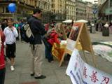 Non seulement des Autrichiens et des Allemands se sont intéressés aux activités mais aussi des Hongrois, des Italiens, des Japonais, des Français, des Britanniques et des Coréens. Ils se sont tous arrêtés pour écouter les informations données par les pratiquants. Un pratiquant chinois a eu l’occasion de parler à un grand groupe de touristes chinois des crimes qui sont commis par le PCC. En outre ils ont pu regarder avec attention les panneaux d’expositions de photos et les banderoles. Un autre pratiquant a pu avoir une conversation profonde avec une dame sinologue. Elle a dit : « Ma Chine ! Je connais la situation du Falun Gong. Ce qui se passe actuellement est tellement horrible ! »