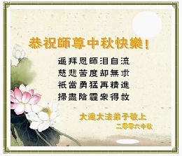 Tous les pratiquants de Falun Dafa de Chine Continentale souhaitent respectueusement au Maître un joyeux Festival de la Lune de la Mi-Automne!
