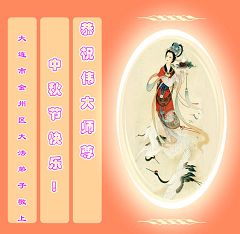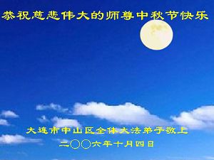 Tous les pratiquants de Falun Dafa du district de Zhongshan, ville de Dalian souhaitent respectueusement au grand et vénérable Maître une joyeuse Fête de la Lune de la mi-automne!