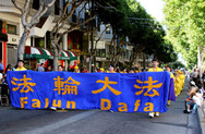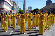 Le temps, ce jour là à San Francisco était beau et doux. Le contingent des pratiquants du Falun Gong était mené par la Fanfare Céleste de l’Ouest des Etats-Unis. Ils ont joué « Falun Dafa est Bon », « Belle Amérique » et d’autres compositions. Derrière eux, il y avait un char sur lequel un groupe faisait la démonstration des exercices, une Danse d’Epée exécutée par des jeunes pratiquants de l’Ecole Minghui. Certains spectateurs sur le parcours suivaient la musique jouée par la Fanfare et dansaient en rythme. D’autres manifestaient bruyamment leur joie, d’autres encore applaudissaient. Certains ont appris les exercices en compagnie des pratiquants. Les personnes qui connaissaient la vérité ont dit, « Arrêtez la persécution du Falun Gong. »