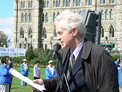 Le 26 septembre, les défenseurs du Falun Gong et huit députés (MP) se sont rassemblés sur la Colline parlementaire du Canada pour inviter le Gouvernement canadien et les Canadiens à agir pour arrêter les atrocités du régime communiste chinois au sujet des prélèvements d’organes sur les pratiquants du Falun Gong encore vivants. David Kilgour, l'ancien secrétaire d'État pour la région Asie-Pacifique et ancien député a présenté un discours au rassemblement. Après, un journaliste a interviewé M. Kilgour.