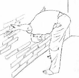 a. On oblige le pratiquant à se pencher avec la tête qui touche les jambes et la tête et le dos qui touchent le mur. Le pratiquant est alors poussé vers le mur.