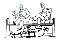 b. Forcer un pratiquant à se plier en deux. S'il ne peut pas se plier en deux, deux personnes s'assiéront sur le pratiquant pour le forcer à se plier en deux.