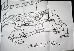 c. Forcer le pratiquant à ramper sur le sol. Deux personnes tirent les jambes du pratiquant dans des directions opposées. Le pratiquant ne peut plus marcher correctement pendant plusieurs mois après le supplice de cette torture.