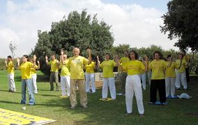 Le jour suivant, les pratiquants ont tenu des activités à Tel Aviv. Les pratiquants ont installé un fond de scène en utilisant deux grands caractères chinois disant « Rectification de la loi », les gens ont joui de deux heures de musique créées par les pratiquants et ont senti la splendeur de Falun Dafa.