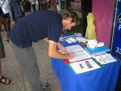 Les bénévoles ont continué d’annoncer les nouvelles au sujet des démissions du parti et la vérité du Falun Gong. Les pratiquants ont également donné des dépliants et collecté des signatures pour condamner le PCC. Beaucoup de groupes de touristes chinois sont passés tout près. Chaque fois que les touristes chinois passaient à proximité, un bénévole leur disait: « Nous sommes tous des Chinois et nous aimons notre pays. Mais, aimer la Chine n’est pas la même chose qu’aimer le PCC. Ainsi, s’il vous plaît, saisissez l’occasion de démissionner du PCC. Allons construire une nouvelle Chine sans le PCC. Merci et bon voyage."