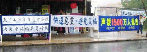 Le matin du 4 novembre 2006, le Centre d’aide pour démissionner du parti a organisé une activité, « le grand mur du courage », pour soutenir les 15 millions de démissions du parti communiste chinois (PCC). Ils ont également annoncé les nouvelles que Jia Jia, le secrétaire général de l'Association de science et technologie de la province du Shanxi, a quitté son groupe d'excursion après être arrivé à Taiwan et a publiquement témoigné de la popularité croissante et de l'impact significatif de la vague des démissions du parti en Chine.