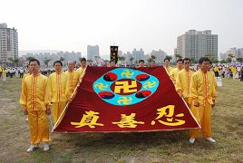 Les tambours de ceinture étaient en tête du défilé. Trois pratiquants dans les costumes dorés d'exercices tenaient une grande banderole sur laquelle on pouvait lire, « Authenticité Bienveillance Patience. » Suivait une autre grande banderole avec le symbole du Falun.