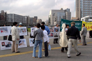 Les pratiquants mettent en place bannières et panneaux dénonçant la persécution qui attirent les passants qui viennent pour en apprendre davantage.