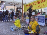 Avec l’aide du Député Maire et d’autres fonctionnaires du gouvernement les pratiquants de Falun Gong ont installé leur stand au meilleur endroit de la place, au centre ville. La municipalité leur a procuré un grand parasol ainsi que deux tables. Quelques pratiquants faisaient la démonstration des exercices en silence pendant que d’autres expliquaient les faits sur la persécution des pratiquants du Falun Gong par le régime communiste chinois et la grande vague de démissions du Parti communiste chinois (PCC) et de ses organisations affiliées depuis la publication des « Neuf commentaires sur le PCC par le journal Epoch Times.