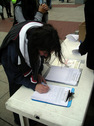 | Signature de la pétition demandant la fin de la persécution | Prendre le temps de bien s’informer. | Un pratiquant explique les faits à quelqu’un entrain de signer la pétition. |