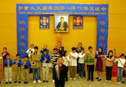La salle de la conférence était chaleureusement décorée. Un portrait de Maître Li était suspendu au milieu du mur central. A côté du portrait il y avait le couplet " Un son de carillons ébranle le monde de la Loi." "La voix de la Loi se répand dans les dix directions." ("Cloche de la tour" du volume II de Hong Yin - traduction française provisoire) Les grands caractères d'or illuminaient toute la salle. La Fanfare de la Terre Divine de Toronto, établie il y a six mois, est un des plus grands orchestres au Canada. Elle a joué dans une quinzaine de défilés et de concerts dans six villes différentes. Les membres de la fanfare ont partagé leurs expériences touchantes de cultivation.