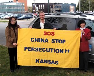 Ces partisans du Falun Gong, venant de Lawrence et de Kansas City, apportent leur message aux villes à travers le Kansas dans « Une Tournée SOS en voiture ». Visitant les fonctionnaires municipaux, les bibliothèques et les médias, ils informent les résidants que le gouvernement chinois prélève les organes des pratiquants du Falun Gong dans la nation communiste. Felice Boewe, résidente de Kansas City et Laurent Adam résident de Miller ont visité Leavenworth lors de leur excursion de 20 villes du Kansas. Boewe, qui est née en Chine, a dit que la persécution des pratiquants du Falun Gong n'est pas bien connue en Chine ou internationalement en raison de la suppression d'information par le gouvernement communiste. Le Falun Gong a des milliers de pratiquants aux Etats-Unis, ont dit Boewe et Miller. En Chine, il y a apparemment plus de 100 millions de pratiquants du Falun Gong.
