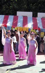 Pour préparer l’interprétation de la dance à midi, ils ont revêtus les costumes de la Tang Dynastie. Voir de tels costumes est rare pour plusieurs personnes, qui ont été fascinées et elles sont venues prendre des photos. Vêtus de leur costumes, les pratiquants de Falun Gong ont distribué des dépliants et parlé avec les gens au sujet du Falun Gong. Deux enfants pratiquants ont fait la démonstration des cinq séries d’exercices vêtus d’uniforme d’exercice dorés.