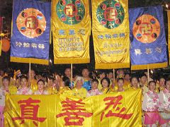 | Les pratiquants déploient des banderoles disant « Authenticité- Bienveillance-Patience » et « Falun Dafa est bon » en chinois et en thaïlandais. |