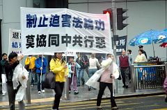 Le 13 décembre 2006, les pratiquants de Falun Gong de Hong Kong ont fait une marche sous la pluie pour aller au Bureau de liaison du gouvernement populaire central et au siège social du gouvernement pour protester contre les actions de la police qui ont utilisé la force pour enlever les pratiquants de Falun Gong protestant paisiblement lors de la visite de Wu Bangguo, Président du Congrès Populaire National du Parti communiste chinois (PCC). Ils ont demandé à tous les niveaux du gouvernement de Hong Kong de voir clairement la nature perverse du PCC, de se débarrasser de la peur du PCC, de soutenir la justice et la conscience, de sauvegarder les droits de l'homme et la loi et de ne pas aider le PCC dans ses crimes.