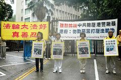 La délégation en visite incluait Wang Xudong, ministre de l'industrie de l'information et criminel clé dans la persécution du Falun Gong. Les pratiquants ont demandé à la police la permission de déployer trois banderoles devant le Bureau de liaison réclamant la fin de la persécution. Sous la pression du PCC, la police de Hong Kong n'a pas aidé les pratiquants de Falun Gong dans leur droit à manifester paisiblement, et à la place, la police a éloigné les manifestants et a finalement envoyé un grand groupe de policiers pour vider l’endroit. En prenant la sécurité comme prétexte, la police s’est emparée des pratiquants, les a tirés, traînés et les a emmenés à la porte arrière du Bureau de liaison. Ils ont rejeté la demande des pratiquants de déployer une seule banderole à côté de la porte d’entrée.