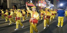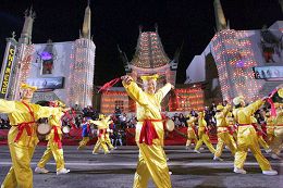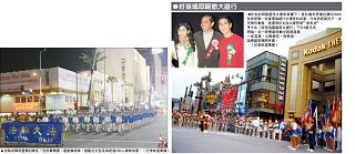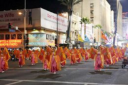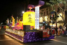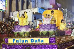 Le 75e Défilé annuel de Noël de Hollywood s’est tenu dans la soirée du 26 novembre 2006, à Los Angeles. Les pratiquants de Falun Gong ont été invités à participer à cette fête de longue date. Le grand déploiement de pratiquants, avec ses costumes colorés, ses tambours vigoureux et exaltants et son char allégorique admirablement décoré, ont attiré l'attention des médias. Les gens tout au long du parcours les ont applaudis et acclamés constamment. Il y a eu également des gens qui ont joint leurs mains ensemble, incliné la tête et salué les pratiquants en faisant « Heshi ».