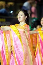 Les fées célestes dans des costumes orange de la dynastie des Tang suivaient la fanfare. Elles dansaient avec élégance au son de la musique paisible. Leurs longues manches volaient dans les airs lorsqu’elles dansaient, communiquant le message des pratiquants : « Nous souhaitons transmettre à tout le monde la splendeur de Falun Dafa ».