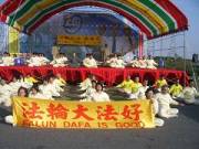 C’était la première fois que les pratiquants de Falun Gong étaient invités à l’événement. À cause d’un front froid qui venait tout juste d’arriver, la température était froide et humide et il y avait peu de visiteurs au début. Durant l’après-midi, les nuages se sont dispersés et le soleil a répandu sa chaleur et c’est alors que de plus en plus de visiteurs sont arrivés. La démonstration des exercices du Falun Gong était programmée à 15h sur la scène. Parmi les participants, il y avaient de jeunes pratiquants de 12 ans ainsi que des vieux de 70 et 80 ans. Quand la musique a commencé à jouer, lente et paisible, les exercices solennels ont apporté tranquillité et paix à l’environnement. Les spectateurs ont regardé attentivement.