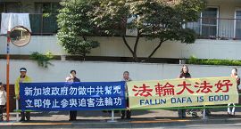 Les pratiquants japonais de Falun Gong sont allés à l'ambassade de Singapour au Japon le matin du 1er décembre 2006 pour protester auprès de la Cour de Singapour parce qu’elle n’a pas tenu compte de faits et qu’elle a rendu un jugement injuste à l'encontre de deux pratiquants de Falun Gong qui protestaient paisiblement devant l'ambassade chinoise à Singapour en juillet. Les deux pratiquants ont été emprisonnés. Les pratiquants japonais encouragent fortement le gouvernement de Singapour à les libérer immédiatement et sans conditions.