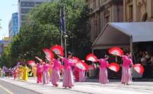 Bien qu'il faisait très chaud, les résidents de la localité se sont enlignés le long des deux côtés du parcours du défilé. Le groupe des pratiquants de Falun Gong, dans leurs costumes d'exercice jaunes, a attiré beaucoup de gens qui ont pris beaucoup de photos. Le groupe était précédé par trois petits pratiquants qui tenaient trois grandes plaques circulaires avec les mots « Vérité, Compassion et Tolérance » inscrits dessus, suivi d’une banderole de Falun Dafa qui à son tour était suivie par la troupe des tambours de ceinture, des danseurs « des fées célestes » et de pratiquants vêtus de beaux vêtements inspirés de la dynastie Tang. Un char allégorique clôturait le cortège. Quand les pratiquants ont atteint la fin du parcours pour le défilé, plusieurs personnes sont venues prendre des photos avec les pratiquants, comme souvenir du grand défilé.